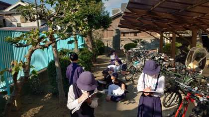 秋の植物の様子について学習をしていたようで、春に鮮やかな花を咲かせていたツツジの今の様子をスケッチしているようです。