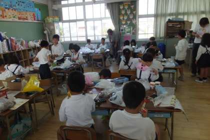 錐で穴をあけ竹串でつないだり箱にのりでくっつけたり、いろいろと工夫をしていました。