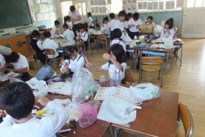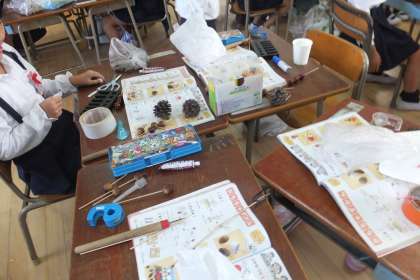 10月23日(金)、1年生が生活科の学習の時間に、大泉緑地への遠足で見つけてきたドングリや松ぼっくりを使って、オモチャを作っていました。