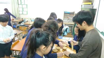 5年2組の教室では育てていたバケツ稲もみを取り、もみすりを行っていました。