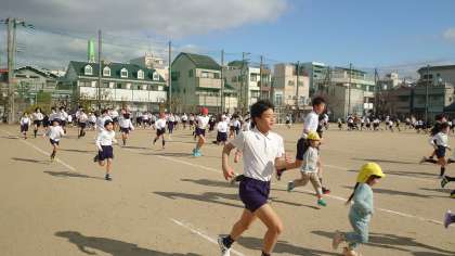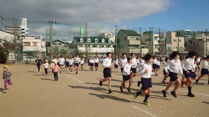 見学の途中で20分休みになり、かけ足週間の取り組みが始まったの見て、保育所の先生が「みんなも一緒に走ろう!」と声をかけました。すると、黄色い帽子を被った園児たちが嬉しそうに一斉に駆け出して小学生の仲間入りに!