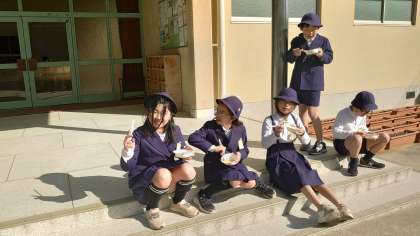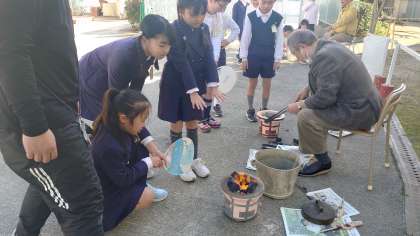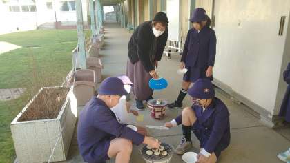 体育館前の広場では、七輪を用いて焼き餅を実践。七輪で焼いて砂糖醤油をつけて食べる餅の味は別格だったようで、「もう一つ食べたい!」という声がたくさん聞かれました。