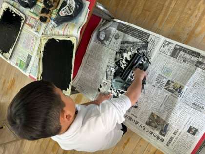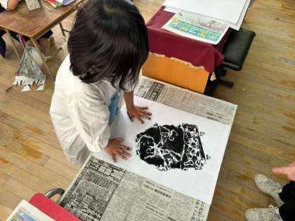 今日は仕上げ段階に入っていました。ローラーを使う際に、インキで手や服を汚さないよう気を付けながら慎重に作業しています。