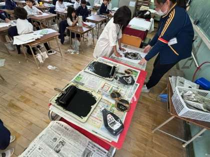 紙版画で鬼の顔を作成中の1年1組さんです。