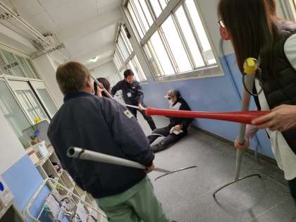 教員が不審者役になり、万が一校内に侵入された際の訓練です。午前中の子どもたちは、誰が不審者役をするのか気にしている様子が見られましたが、訓練中は放送や担任の指示をよく聞いて身を守る行動ができていました。