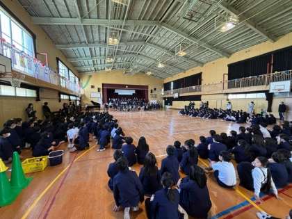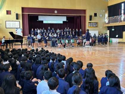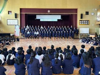 合奏「ひまわりの約束」とアーティスト平井大さんの曲「題名のない今日」の合唱を披露しました。