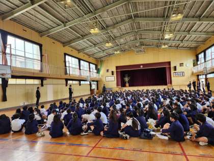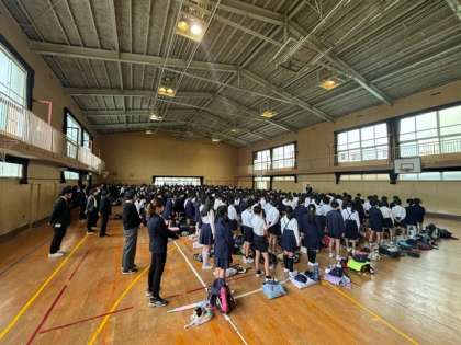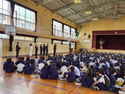 校歌斉唱、校長先生の話、そして転出転入の職員紹介。