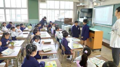 1組は国語の学習で、あいさつの仕方を実践を通して学んでいました。お友達のあいさつの様子を見て、みんなで拍手を贈り合いながら学習を進めています。