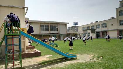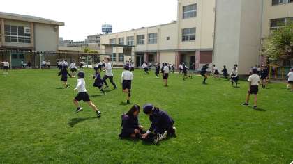 芝生の中運動場は1〜3年生の低学年と4〜6年生の高学年が、1日交代で使用できる決まりです。今日は高学年が使える日でした。20分休みの時間には、たくさんの子ども達が中運動場に出てきて、遊んでいました。