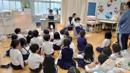 保健室では2年生が聴力検査と視力検査の両方を受けていました。静かに待つことがよくできています。