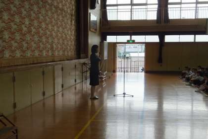 児童朝会は体育館で行われ校長先生のお話の後、教育実習の先生が紹介されました。子どもたちからも「よろしくお願いします!!」と声があがっていました!!