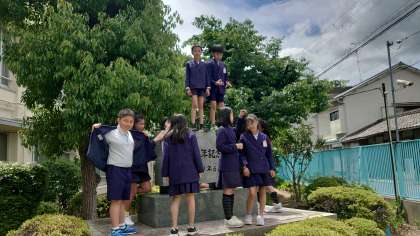1年間をかけて、今年度の行事や6年生の授業風景を撮影していきます。普段は登ってはいけない石碑、今日は特別に登ってグループ撮影などをしました。