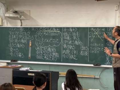 4年2組では、私たちが一人残らずもっている権利について学習しました。子ども達は先生の話に耳を傾けながら、真剣に考えていました。
