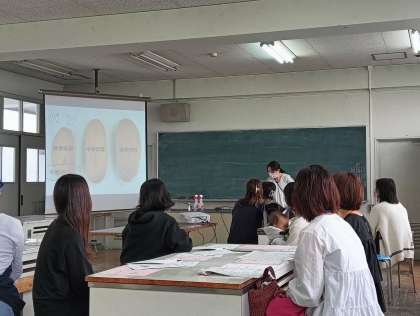 給食がどのように出来上がるのか動画を見た後、栄養士の先生が、コッペパンの大きさが学年によって違う事などを話してくれました。