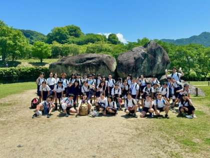 石舞台古墳の前で記念写真です。みんなとても元気そうで安心しました。