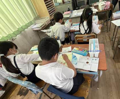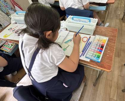 混ぜる水の量で色の濃淡が変わったり、筆を使って描く時の感覚を楽しみながら学習を進めていました。