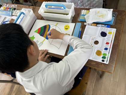 先生の準備した傘の絵に、思い思いの絵具を塗りながら「楽しい!」という言葉がたくさん発してました。
