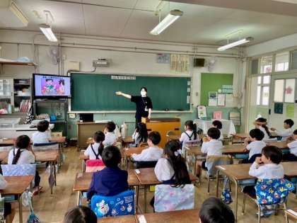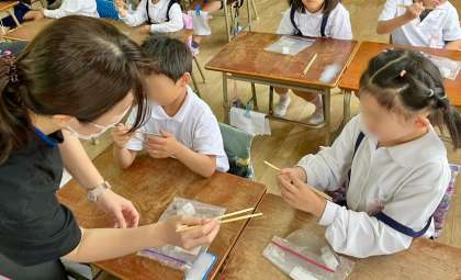16日(木)、1年生は栄養教諭から食育の授業を受け、お箸の正しい持ち方について教えてもらいました。