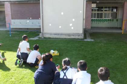 グループごとで場所を決め、鏡で太陽の光を壁に反射させその光を1カ所に集めていました。なかなか光が集まらずみんな苦労していました。やっと集まるとその場所の気温を計測し、光のない時との差を比べました。