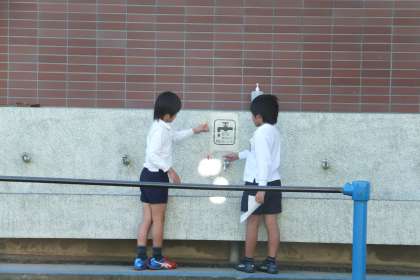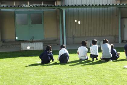 11月11日(水)、3年生が理科の学習で、鏡を持って中運動場に出てきました。
