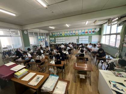 学習者用端末を活用して、原画をよく見ながら描いています。