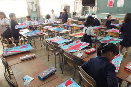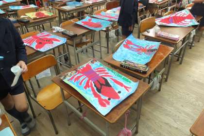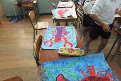 作品展で掲示する作品の仕上げをしていたのです。水中にいるザリガニを表現するために青色の絵の具を塗るのにも工夫して、スポンジを使って濃淡を出していました。