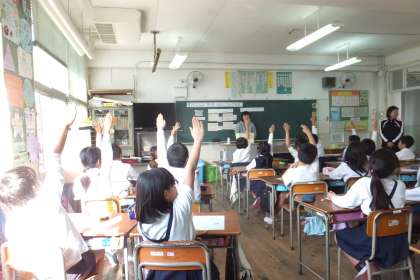 「骨を丈夫にする食べ物について知ろう」という題材で、カルシウムを多く含む食べ物にどのようなものがあるか、?ボックスを使いクイズ形式で教えてくれました。子どもたちはクイズに参加しようと「ハイ、ハイ」と手をあげ、張り切っていました!!