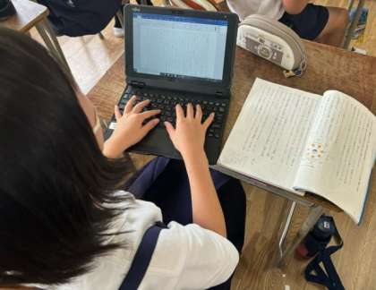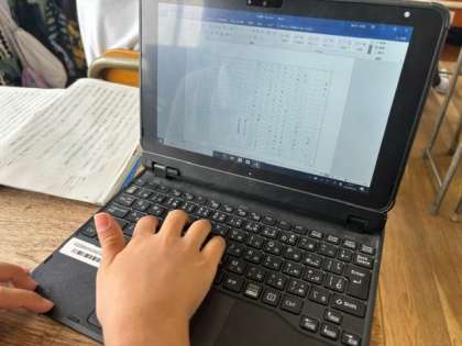 筆者の主張を読み取り、自分の考えをタブレットで入力しています。