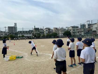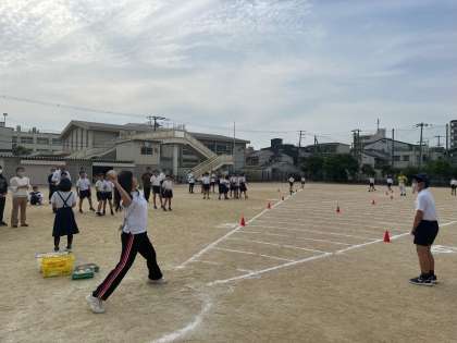最後は、先生方チームも挑戦し、青空に向かってソフトボールを投げました。