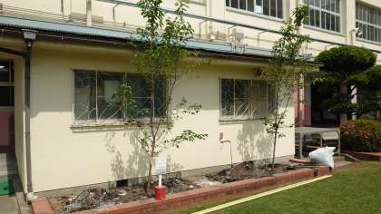 学校では、桜の木を3本植樹しました。2本は職員室前倉庫の裏側に、1本は管理作業員室前の花壇に。