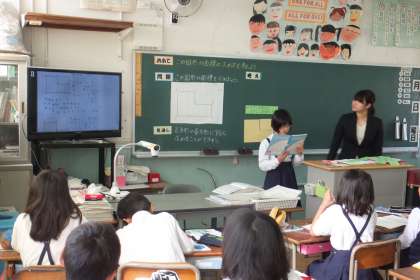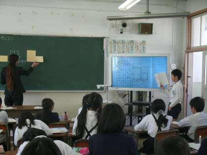 4年生の算数は、2クラスをベガ・アルタイル・デネブの3つのコースに分けて学習していますが、すべてのコースで書画カメラとモニターを学習に活用しています!!