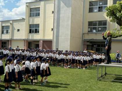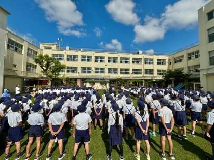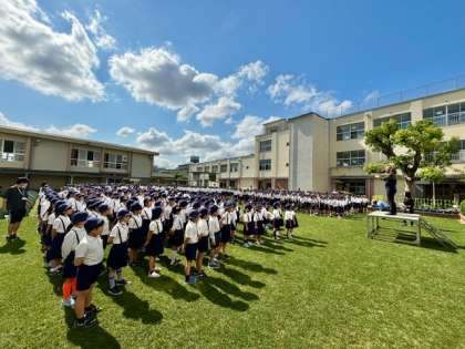 5日(水)中運動場で音楽集会を行いました。今週土曜日に実施する創立150周年記念児童集会で歌う「未来につなげ〜記念日に歌う歌〜」のリハーサルです。
