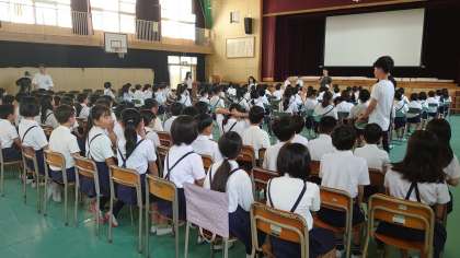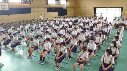 講堂で150周年記念式典に向けた5・6年生合同練習を進めています。