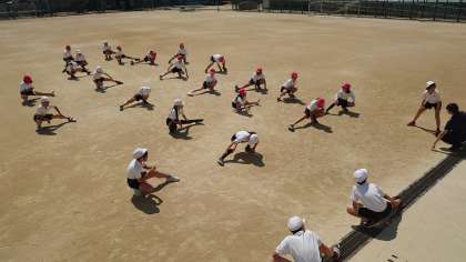 体育係を中心に自分たちで準備体操を進めていました。先生からは「暑いので、マスクは必ずはずしてください。」という指示がありました。