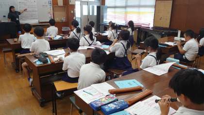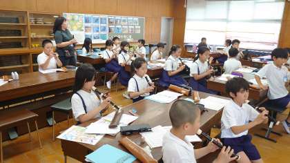 4年1組の音楽の時間には、リコーダーで美しい音を出す練習をしていました。同じ班や隣の友達とふさいでいる穴が間違いないか、正しい音が出せているかを確認しながら取り組んでいます。