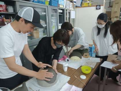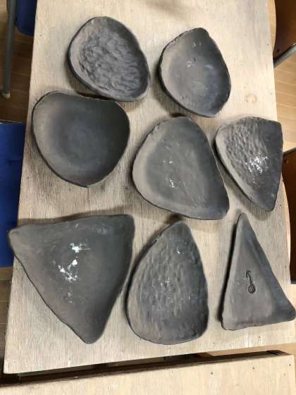 信楽の土を叩きながら三角のお皿を作りました。 指のあとをわざと残したり、それぞれの個性あふれる素敵な作品が出来上がりました!