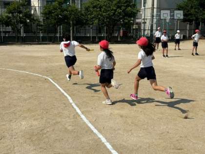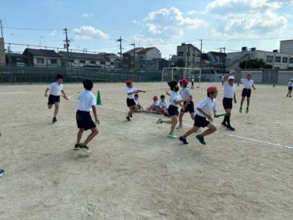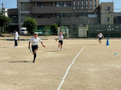 陸上クラブでは、リレー対決をしました。異学年でチームを組んで、バトンパスを成功させるように練習しました。周りで見ているチームメイトやほかのクラブの友達からも応援の声が飛んでいます。