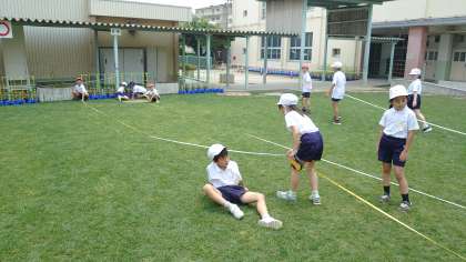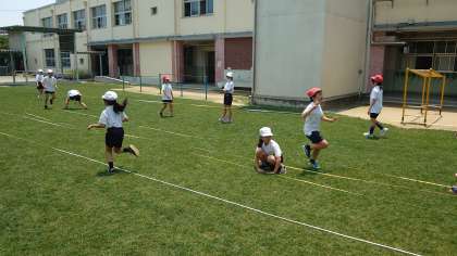中運動場の幅を班の友達と協力して測ろうとしているのですが、「ゆがんでる!」「引っ張って!」などと言いながら、個々に気になった箇所を引っ張ったり伸ばしたりしているため少し苦戦していましたが、それも経験。