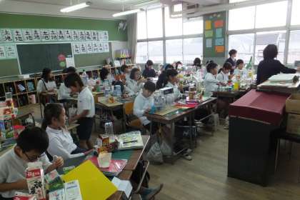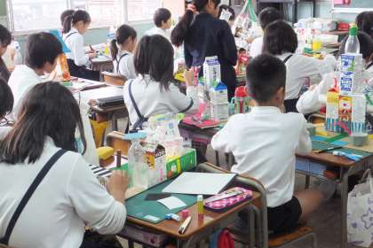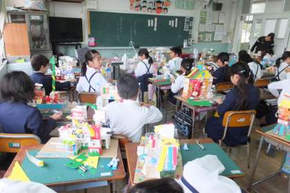 牛乳パックやペットボトルなどのいろいろな容器を使って、未来都市を作っています。お城のような建物や乗り物のような建物。夢のある未来都市が完成しそうです!!