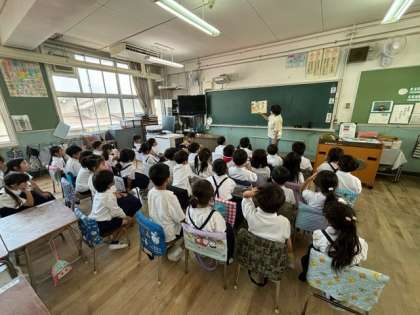 写真は1年1組さんと1年2組さんです。みんな目を大きくしながらお話を聞いていました。