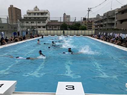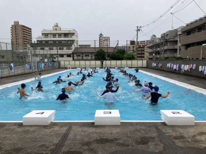 曇り空で過ごしやすい気候でしたが、水の中はとても冷たかったようです。それでも水泳学習が始まったことのわくわく感で笑顔がたくさん見られました。