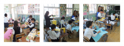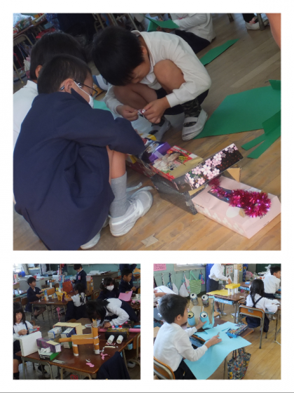 箱や牛乳パックなどを使って動物の形をつくり、色画用紙で模様や顔を仕上げていきます。ゾウやキリン、ライオンもいます。机の上にのらないくらい大きなワニもいました!!