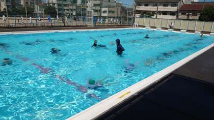 プール学習では危険が伴うこと、命を守って安全に学習を進めるために一番後ろに並んでいる子にも指示が聞こえるようにしようという先生の話を聞いてから入水しました。初めは「わー!冷たい!気持ちがいい!」と思い思いに声をあげていた子ども達でしたが、次の指示が出るとその内容を集中して聞いて楽しく学習を進めていました。