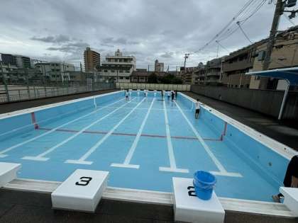それでも、水質を安全に保つために清掃活動実施です。雨の中、若手の先生たちが中心に頑張りました。今週もプールで楽しむ子供たちが見られたらいいのですが、、、