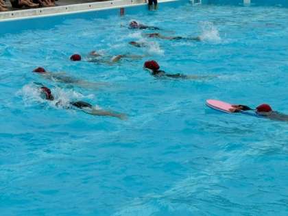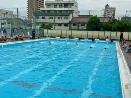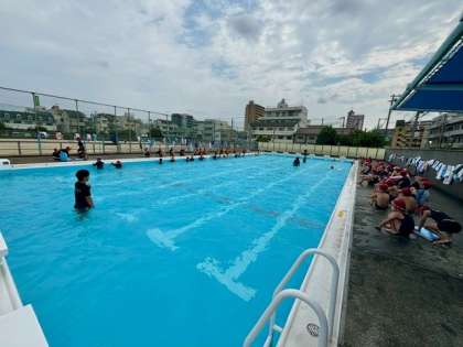 2年生の水泳学習の様子です。けのび、バタ足の練習をして、どれくらい泳げるのか記録を計りました。