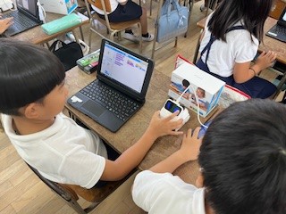 3年1組では、ロボットを使ってプログラミングの学習をしていました。