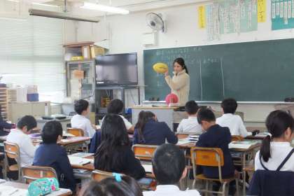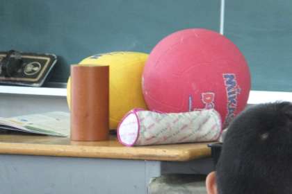 ボールのような丸い形の特徴を調べていました。先生が持ってきたドッチボールやラグビーボール、空き缶を上から見たり横から見たりして、比べていました。