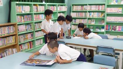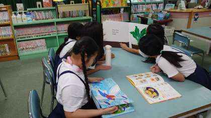 図書の時間の様子です。大型絵本や紙芝居を友達と楽しんだり、自分の好きな本を黙々と読んだりと思い思いに読書活動を楽しんでいます。