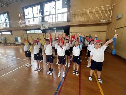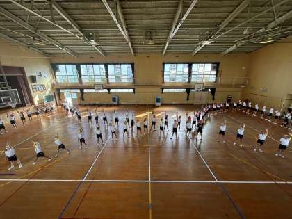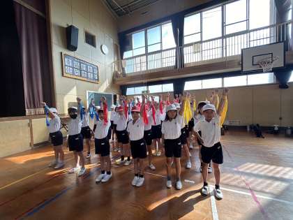 東運動場で練習したいのですが、校庭の状態が悪く、体育館で練習しました。左手アップのポーズが決まっています!残り日数は少ないですが、最後運動場でしっかり確認できることを祈ります。
