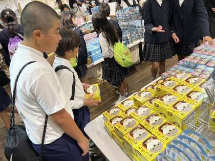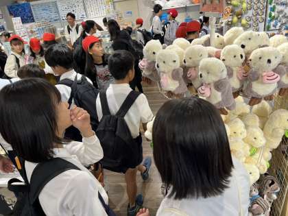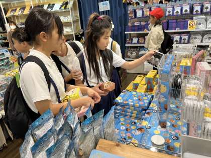 水族館のお土産にくぎづけ。